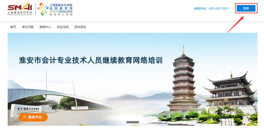 (1)打开淮安市会计专业技术人员网络继续教育网址:acchuaian.ce.esnai.net培训首页,右上角为学员“登录区”,点击“登录”。