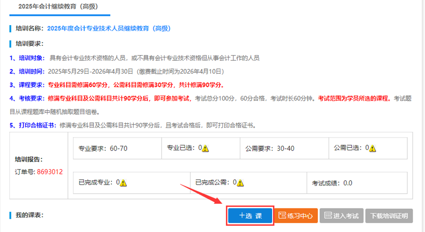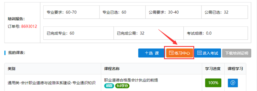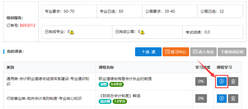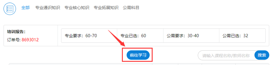 (1)完成选课后,点击“前往学习”进入培训订单页面。