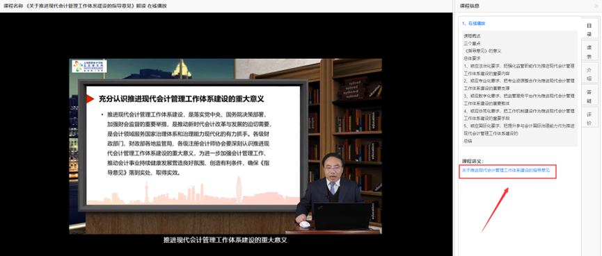 (3)讲义下载:视频播放页面右侧目录下方,可浏览下载一些经授课教师授权的PDF课件或相关阅读材料。