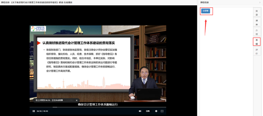 (5)答疑:在课程播放页面右侧“答疑”,可以提问培训课程相关问题。