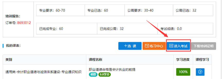 (1)达到规定的学分后,点击“进入考试”按钮,开始考试。