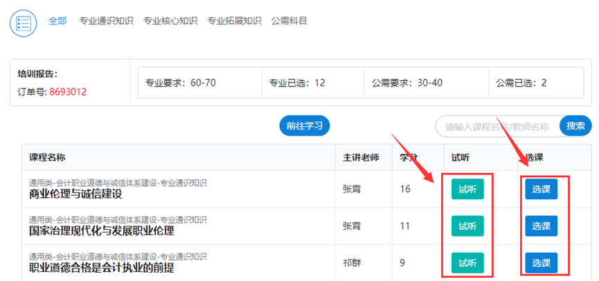 付款完成后,点击“选课”按钮,在选课页面,根据学分要求选择课程(点击“选课”,即可快速完成选课;您也可以先点“试听”按钮,试听后再选课)。